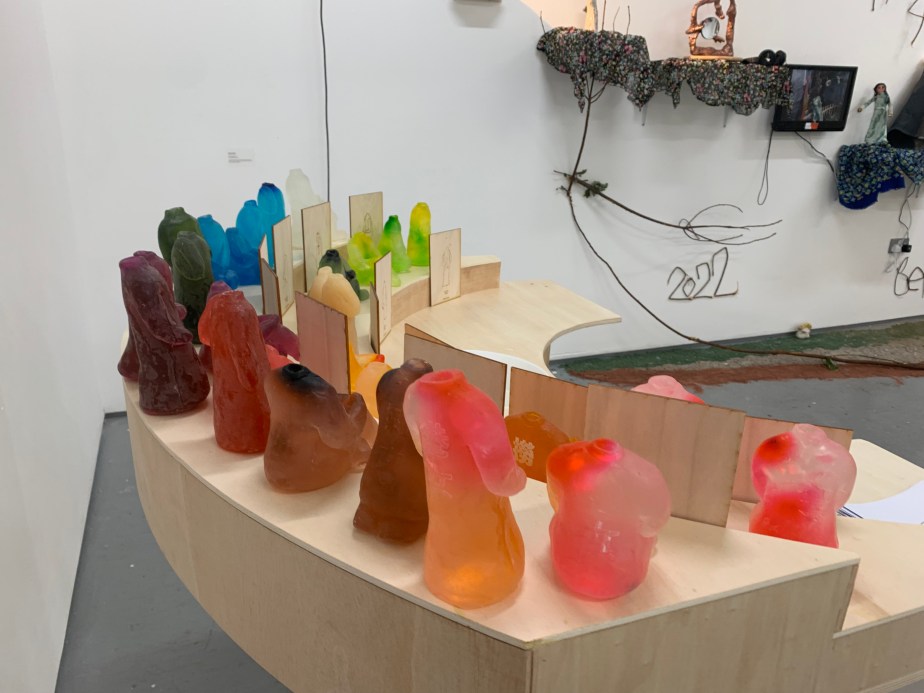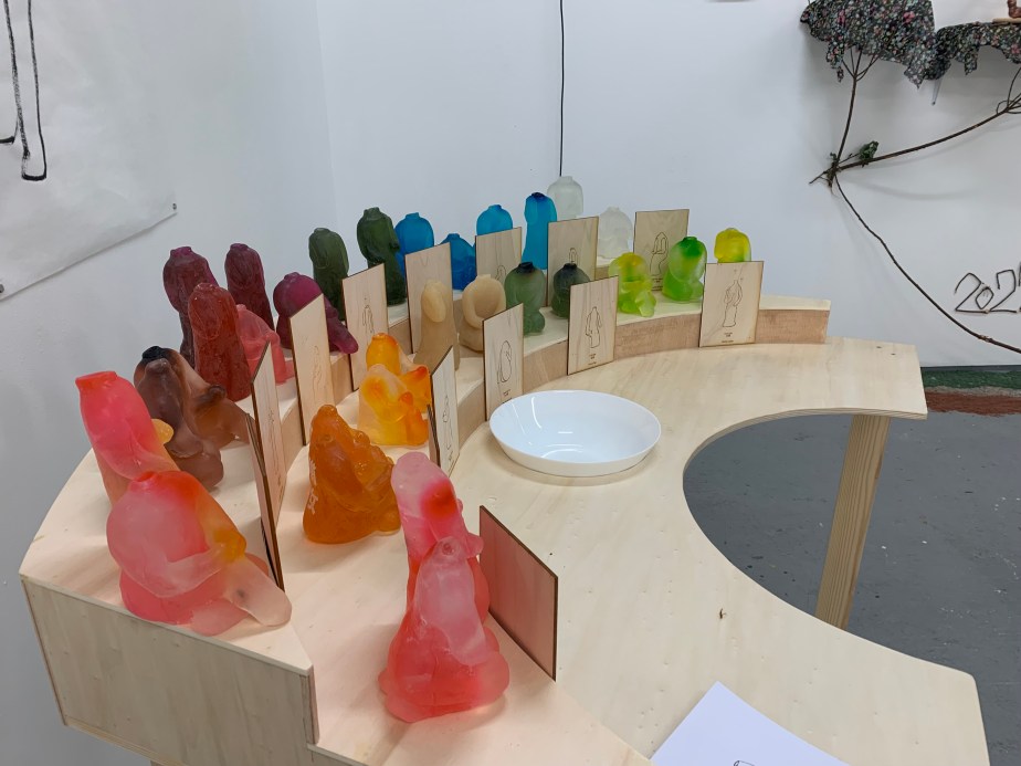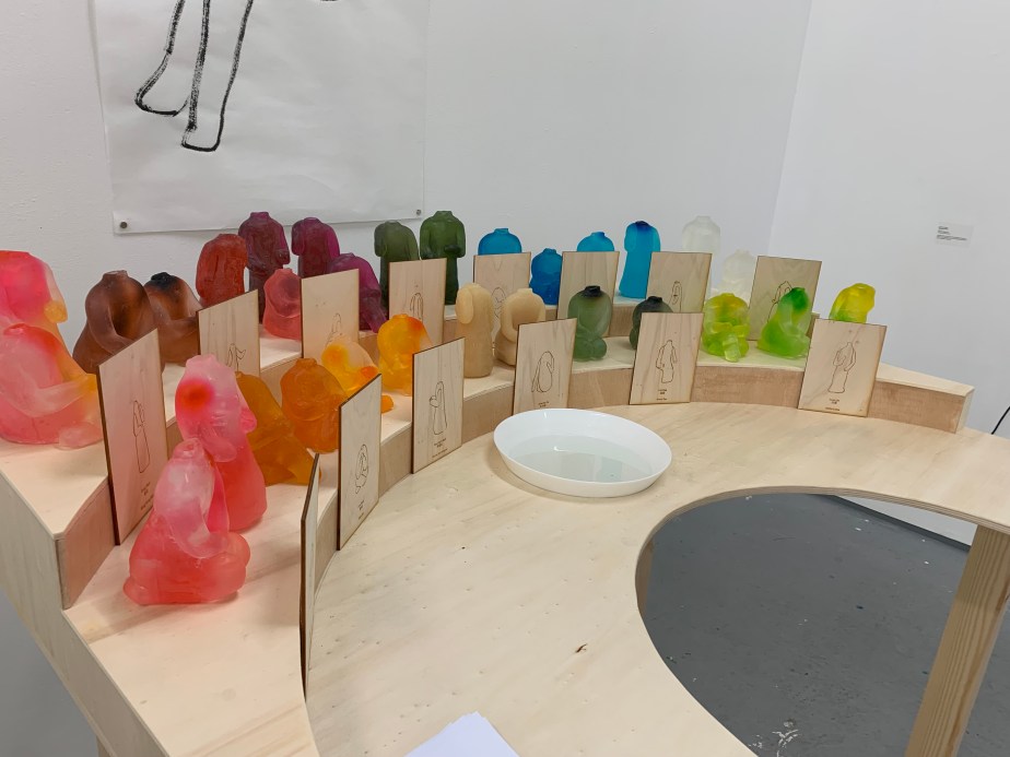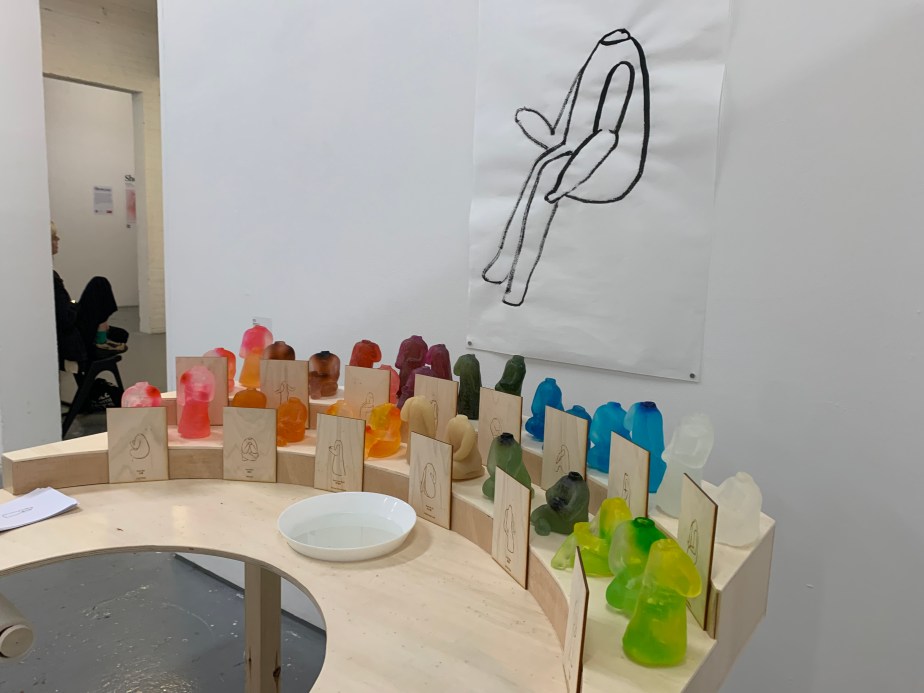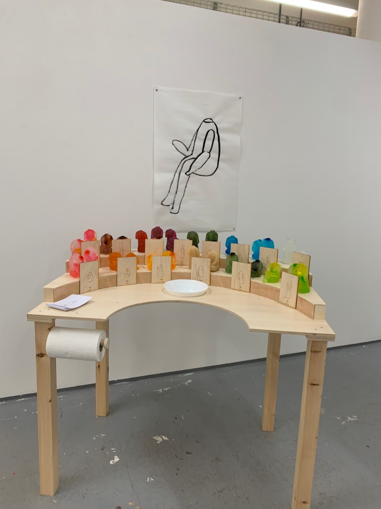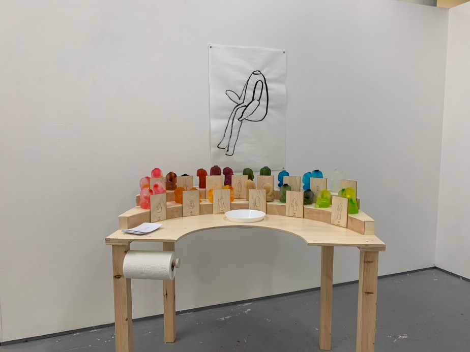 Installation with soap sculptures, drawing in ink and wood table.