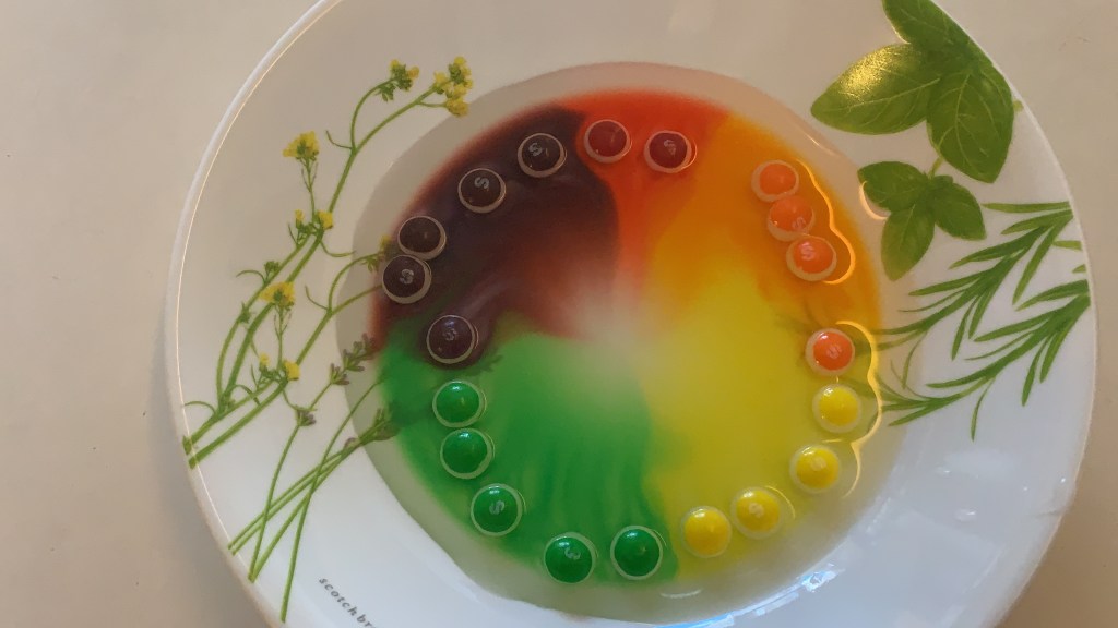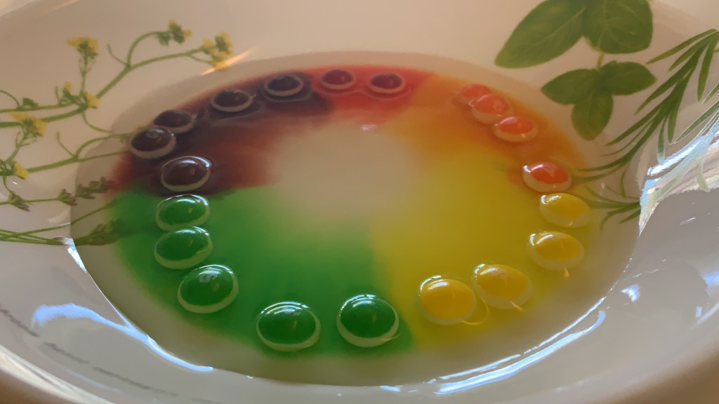 I could feel the coolness in my throat when I taste the mint candy and the coolness seems to spread to my whole body. I never taste mint candy before, and it made me feel uncomfortable. It got worse after I drank the water. But pulling the water into plate of Skittles is pleasant, I like the way that the colour change in the water and how the Skittles lost their colour. The colour spread from the circle to the centre, which looks like time travel scene or transformation of character (such as Pretty Cure) in the animation I watch when I was a kid. The problem is that I was too focus on the Mint candy and could not think of negative feeling at the moment or focus on the Skittles Skittles when the instruction told as the think of negative thoughts which is disappearing in the center.
