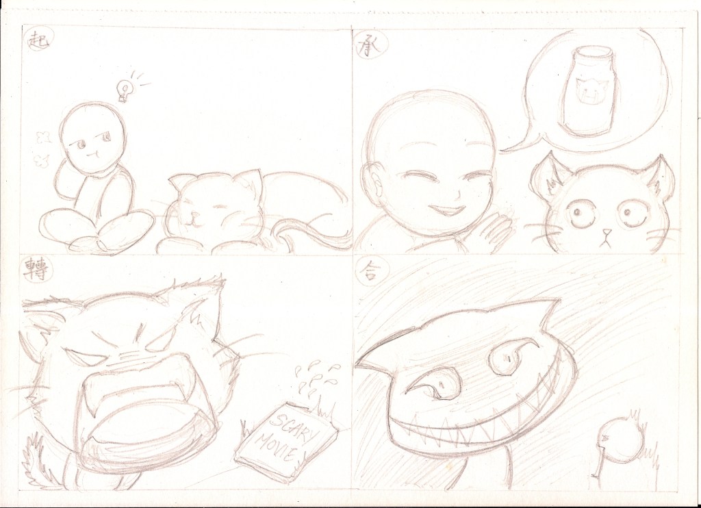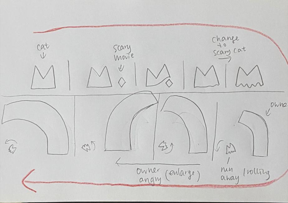 Imagining the feelings what the characters are having when I draw the lines, especially focus on the one with the cat when it becomes a scary cat. Although the lines could easily represent the cat in a disgusting state, the change in lines is not enough.