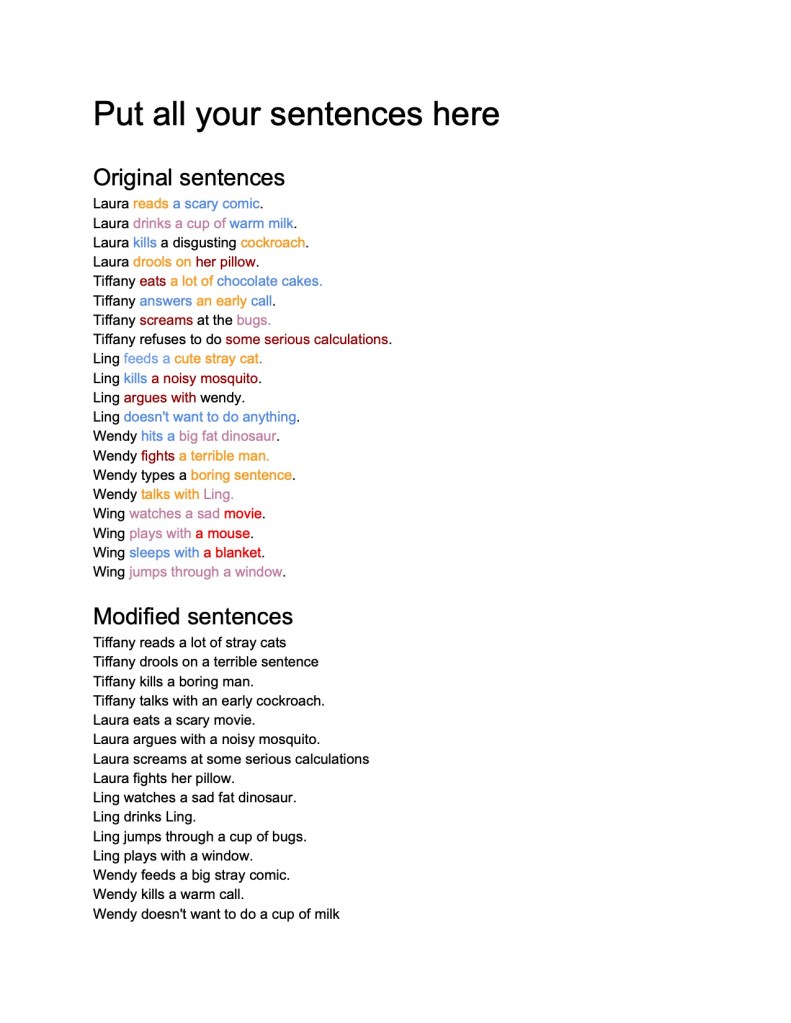Each member in group write down 5 recent events randomly in the “Original sentences”. Then, swapping the subject, verb, adjective/adverb, object among all the sentences and come up with a new list”Modified sentences”.