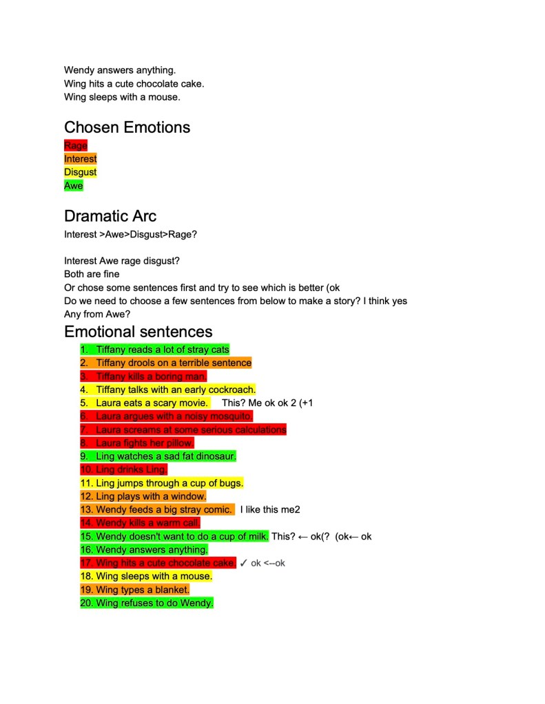 At the same time, create the dramatic arc. Then, pick a sentence from each emotional type and arrange the 3 to 4 emotions in linear order to fit into dramatic arc.